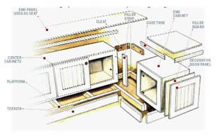 4. Hide the platform with toekick molding secured with 1-inch finish nails. For a truly custom look, attach filler boards and decorative panels that mimic the look of cabinet doors, using 2-inch finish screws fastened from inside the end cabinets.