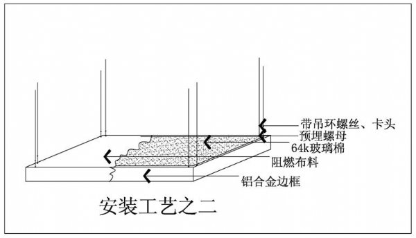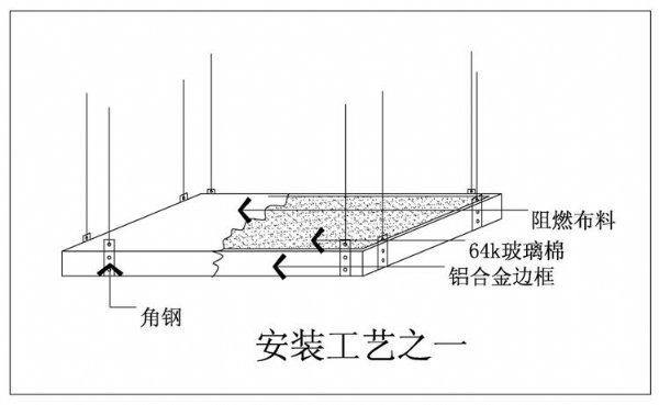6、角钢安装完毕后,经检查标高、间距、平直度和吊挂荷载符合设计要求后,方可进行下一步工程施工。且应等水、电、空调等专业工序完成后方可安装空间吸音体。