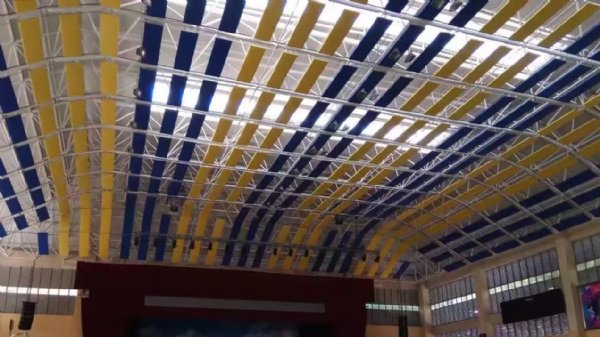 当今大型体育馆中的声学设计都面临上述问题的挑战,要求有限的声学处理面积能获得更大的吸声量。尽可能缩短大空间比赛厅的混响时间。有效的方法是增大空间吸声体的吸声量(增大吸声体的数量和单位面积的吸声量)。
