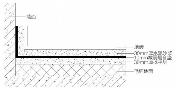3、在10mm厚减震隔音垫上再覆盖一层30mm厚水泥沙浆。