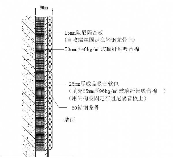1、首先结构墙体安装50轻钢龙骨,留有50mm空腔,填充50mm厚48kg/m3玻璃纤维吸音棉板,起消音、吸音的作用。玻璃纤维吸音棉板防火级别达A级。