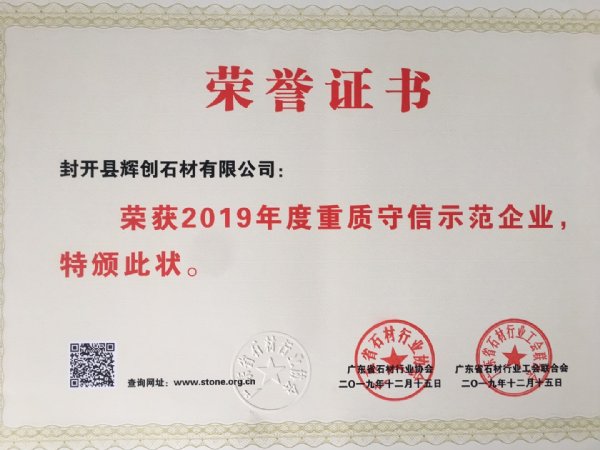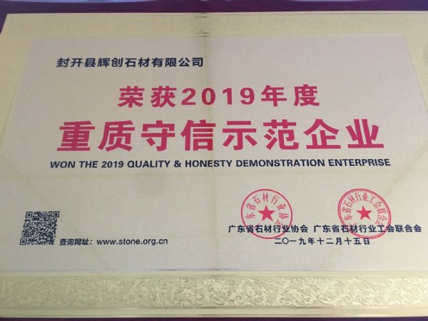 祝贺封开县辉创石材有限公司荣获由广东省石材协会;广东省石材行业工会联合会颁发的2019年度重质守信示范企业!