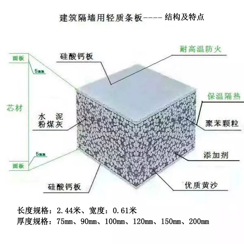 水泥轻质隔墙板是一种由水泥、黄沙、纸浆、聚苯颗粒为原材料制作而成的一种可用于各种建筑的隔墙隔断的建筑板材,它的两面的面板是硅酸钙板,防火等**可以达到不燃A1**,并且防水防潮、防腐耐候,中间是聚苯颗粒和水泥发泡,有吸声隔音、质轻**强,可以任意切割、拼接、开槽、走线、吊挂力强等**点。