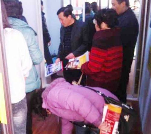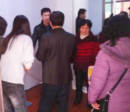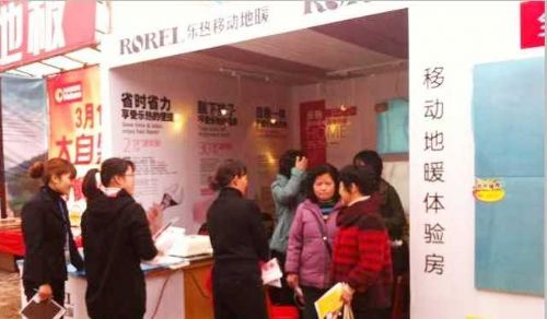 参观者触摸地板感受乐热移动地暖的温暖效果