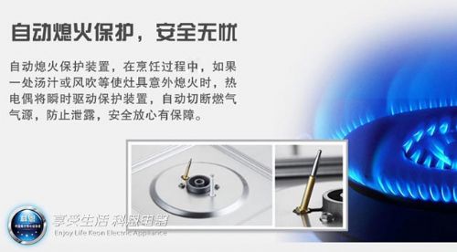 安装极差点火器的燃气灶连续点10次可能只能点着五六次,甚至更少,若是这样,由于火没点起来,气体就会漏出来,漏的多了,当再点着时就会发生爆燃,从而伤到人。而没有熄火保护装置的话,一旦煤气泄漏,若无人发现,气体就会充满整个房间,稍遇明火,整幢楼都有被炸的危险。因此,熄火保护装置可谓相当的重要。我国现行的《家用燃气灶具》国家标准对嵌入式燃气灶的自动熄火保护功能作了强制性要求,当炉火被外溢的液体浇灭或者被风吹灭时,燃气灶必须能在60秒之内自动切断燃气。据了解,目前市场上常用的熄火保护方式有三种:热敏式、热电式和光电式。科恩每一款燃气灶都采用了热电偶熄火保护装置,提高了产品的安全性。下面就向大家介绍一下什么是热电偶熄火保护?