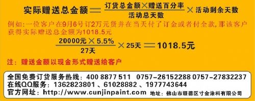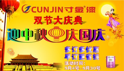 寸金涂料有限公司为了能让全国各地代理商在这涂料旺季迅速提高销量,特别推出“欢庆中秋喜迎国庆双节大庆典”活动,以“多订多优惠,早订更省钱”为主题,订货兑现金即是订货客户获得赠送金额,本公司以现金形式赠送给客户。