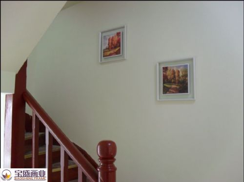 走廊的墙面很适合布置成艺术走廊,可同时挂几幅作品。画框的款式规格应一致,单幅控制在50cm×60cm左右,形成连续的整体,既美观又利于欣赏。如果每幅画上方有