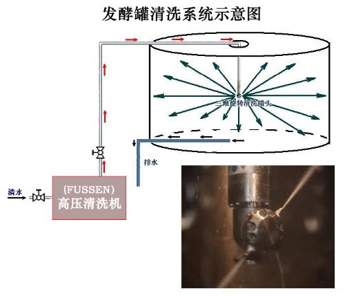 (根据发酵罐大小、罐内污渍、使用频率等,广州富森清洁设备有限公司为您配置合适的高压清洗机、三维旋转喷头,为您量身制定清洗解决方案。)