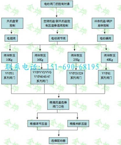 一般电动调节阀的控制对象分为三类:风机盘管控制、空调机组/新风机组控制/压差旁通阀控制/换热机组控制、冷冻机组/锅炉启停控制。如果是风机盘管控制,一般选用西门子VVI46系列的调节阀,口径为DN15、DN20、DN25。如果是空调机组、换热机组等的控制,一般选用西门子VVF31系列、VVF40系列、VVF43系列、VVF47系列、VVF53系列等。如果是冷冻机组、锅炉启停控制,一般选用电动蝶阀西门子VKF42系列。