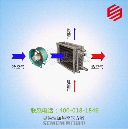 导热油加热空气方案是以导热油为介质,利用循环泵,强制导热油进行液相循环,将高温导热油中的热量传递到冷空气中,使得冷空气快速变热的一种经典加热方案,散热后的导热油经用热设备卸载后,重新通过循环泵,回到导热油加热设备,再吸收热量,传递给冷空气,如此周而复始,实现热量的连续传递,使被加热空气温度升高,达到空气加热的工艺要求。该方案结构合理、配套齐全、安装周期短,运行和维修方便,便于锅炉布置,具有低压、高温、安全、高效节能的特点。运行控制和安全监测装置,可以精密地控制工作温度。
