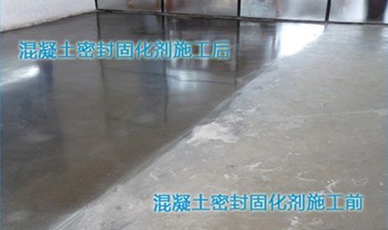 混凝土密封固化剂的工作原理:它由无机物、化学活性物质和硅合物组成,通过有效渗透,进入混凝土内部,与混凝土中化学成分发生渗透的化学反应,形成凝胶,与混凝土中的各成分固化成一坚固实体,从而得到一个无尘、致密的整体,大大提高混凝土的抗渗、耐磨、冻融循环、硬度等各种性能指标。处理30分钟后提高抗压强度45%,提高耐磨性能45%;反应完全后能提高2-3倍的表面硬度。