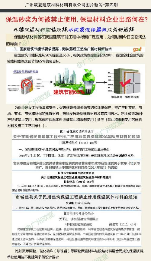 为提高建筑节能效果,促进建筑节能产品(材料)的更新升级,淘汰落后技术和产品。湖南、云南、重庆、北京、湖北及安徽等省市都陆续出台相关政策,民用建筑的墙体、屋面、楼板保温工程中禁止设计和使用保温砂浆类产品。(广州欧复建筑材料有限公司图片新闻-第四期)