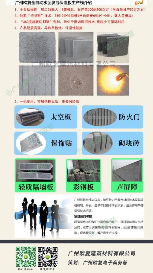 推广应用水泥发泡保温板及发泡水泥保温装饰一体板新型保温材料产品,是适应当下环保、节能的需要,也是建筑节能保温应用技术的发展与进步。欧复扎根建材行业近十年,注重引进欧美新技术及研究创新,现拥有多项发明专利及生产基地,发泡水泥的泡沫质量好、发泡剂利用率高、操作简便、设备故障率低,在国内水泥发泡研发及设备制造领域处于处于垄断地位。欧复保温板项目优势在于生产原料丰富,生产成本低廉,利废环保、政府扶持政策,未来几年有数万亿市场前景。