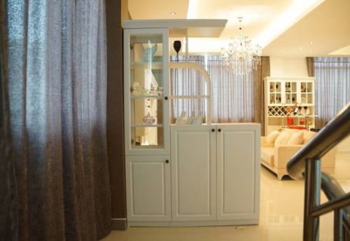 客厅玄关的间隔应以上面通透、下面实心为主,以防止外泄。因此上面可以使用通透的磨砂玻璃或者空心的博古架等。