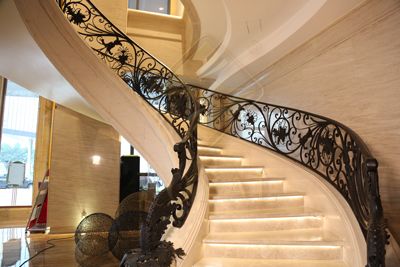 铁艺扶梯通常呈旋转状分布,其独特的古典艺术气息,能把整个室内大厅装饰得熠熠生辉,富丽堂皇。优良的铁艺楼梯触摸起来富有质感,表面光滑,无铁的冰冷感,给人舒适厚重的感觉。