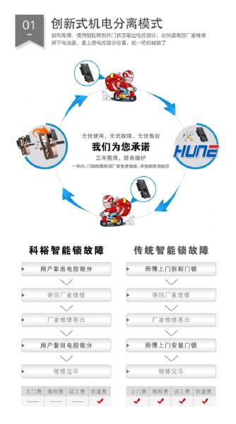 赢得消费者信赖,从根本出发,科裕率先推出颠覆传统产品技术研发模式,独创创新模块专利技术,可“快装、快修”“自动对焦半导体识别系列”918-88新概念系列、918-80荣耀系列指纹锁产品。消费者无需担心门锁因电子模块故障而无法正常使用, 只需要将钥匙转到开门状态即可取出电控模块,门锁仍然可正常开启使用,不影响用户家庭的出入户,电控部分模块则可直接快递寄回科裕售后服务中心维修,维修好的电控模块寄回,消费者安装好后,指纹锁完全恢复原样。完全消除并解决了消费者的后顾之忧,这种颠覆传统的创新技术定将引领行业发展潮流。