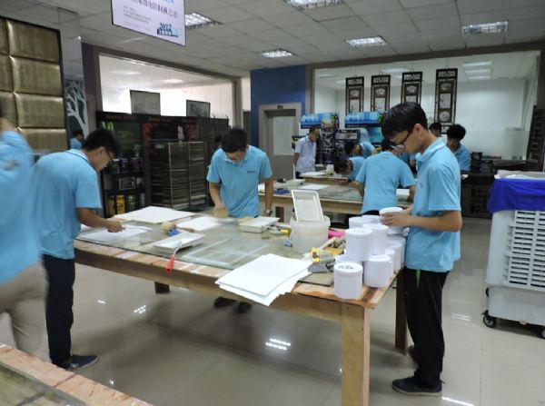 七月,阿里大师办公室内一片热火朝天,青春的活力在此绽放。在涂料厂家阿里大师学习已经有一个月的莘莘学子,正在亲自动手做涂装样板。